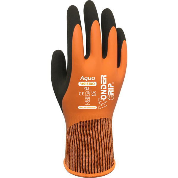 The Wonder Grip WG-318 Aqua is a double latex fully coated glove, constructed on a 13-gauge nylon liner. Thanks to Wonder Grip Technology, the coating brings an unparalleled grip and strength in dry or wet environments. The WG-318 Aqua is 100% waterproof keeping the user’s hands dry and comfortable. It is our preference in terms of grip and flexibility in wet environments. It guarantees comfort and grip while maintaining an excellent level of flexibility.